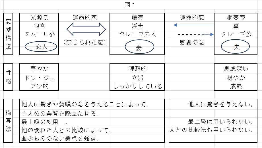 第U部では、膨大な「源氏物語」の中から「光源氏?藤壺?桐壺帝」と、「匂宮?浮舟?薫」の関係を取り出して分析し、「ヌムール公?クレーヴ夫人?クレーヴ公」の関係と対比させている。3つの恋愛の型、および主人公達の性格、その描写法を抽出すると、次のように図式化される。
