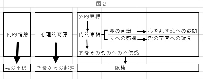 この図式は、源氏物語中、様々なヴァリエーションで繰り返されるし(「朝顔」や「宇治の大君」など)、ラファイエット夫人の他の作品(とりわけ「タンド伯爵夫人」)もまたすべて、同じ構造である。その事からみても、また、「クレーヴの奥方」後半部分や「宇治十帖」では、女主人公達のこのような心理過程が主に描かれていて、彼女達の心の動きによって物語が進展していくということからみても、作者たちがいかに深く、この主題に憑かれていたかがわかる。